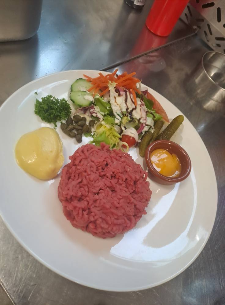 21,00€Le Hamburger du chef Pur Bœuf(bacon, fromage local, œuf, crudités, sauce maison)